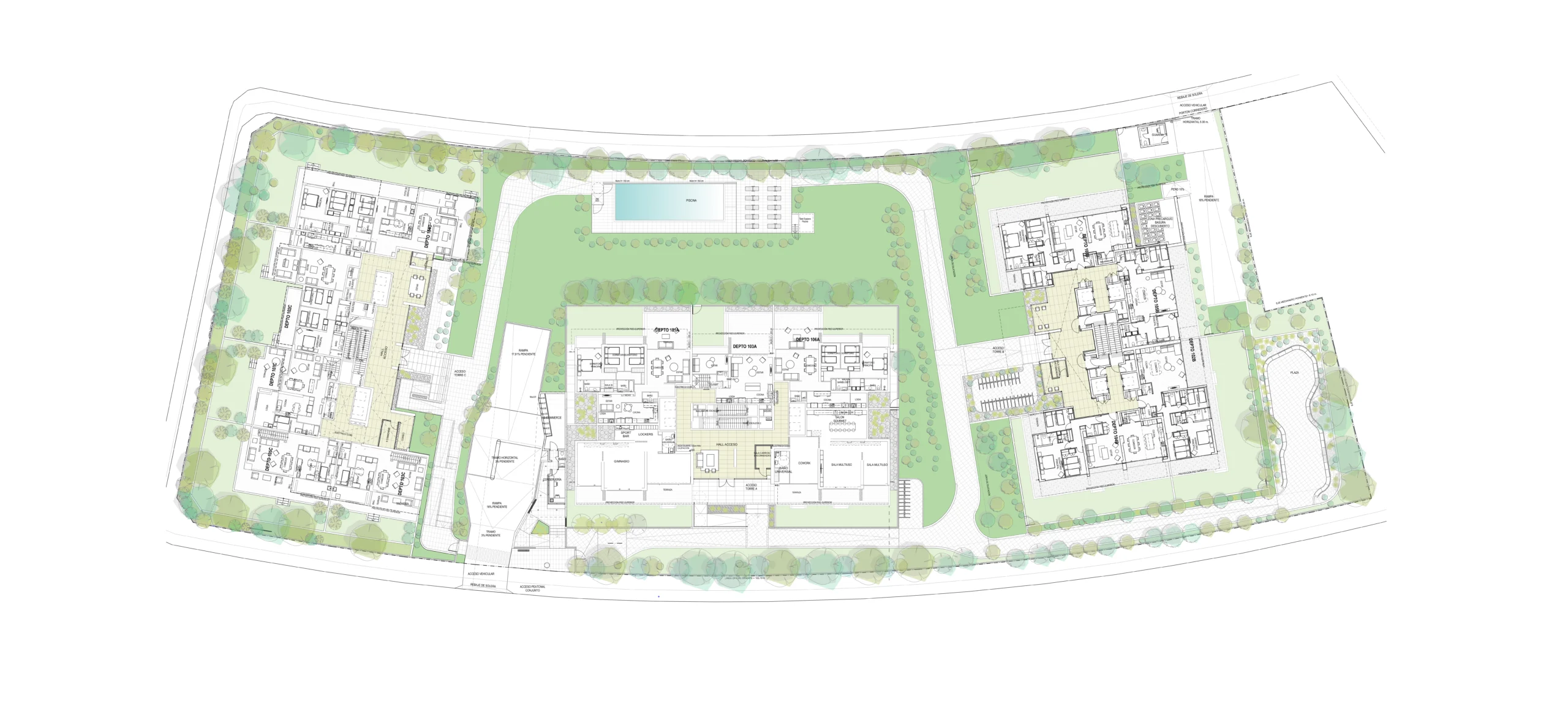 Este proyecto cuenta con un parque de 3.500 m2 diseñado por el paisajista Cristóbal Elgueta, cuya visión y experiencia ha dado forma a un espacio verde único que se integra con el proyecto.